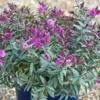 L’Hebe ‘Purple Shamrock’ est une variété de véronique arbustive hybride offrant un feuillage panaché persistant, qui change au fil des saisons et des températures. Ses longues feuilles à centre vert olive sont bordées de jaune. Les jeunes pousses d’un rose pourpré intense sont très attrayantes au-dessus du feuillage. En début d’été, une floraison rose vient compléter le tableau. Ce merveilleux petit arbuste est relativement rustique est facile à cultiver dans nos régions où l’hiver n’est pas trop rigoureux. Cette variété forme naturellement un beau coussin persistant, compact et dense, ornemental toute l’année. La plante est résistante aux maladies, peu exigeante sur la nature du sol et économe en eau une fois bien installée au jardin. C’est aussi une excellente plante pour la terrasse.